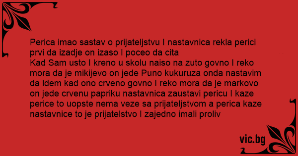 Kad Sam usto I kreno u skolu naiso na zuto govno I reko mora da je mikijevo on jede Puno kukuruza onda nastavim da idem kad ono crveno govno I reko mora da je markovo on jede crvenu papriku nastavnica zaustavi pericu I kaze perice to uopste nema veze sa prijateljstvom a perica kaze nastavnice to je prijatelstvo I zajedno imali proliv