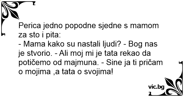 - Mama kako su nastali ljudi? - Bog nas je stvorio. - Ali moj mi je tata rekao da potičemo od majmuna. - Sine ja ti pričam o mojima ,a tata o svojima!