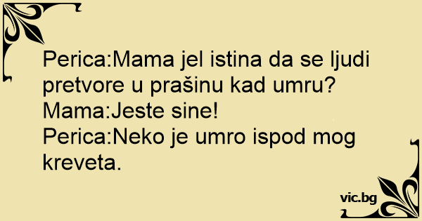 Upita Pericu majku: - Mama jer istina kad neko ljudi umru da se pretvore u prasinu? - Da Sine. - Pa Mama, čini mi se da je neko umro ispod mog kreveta!