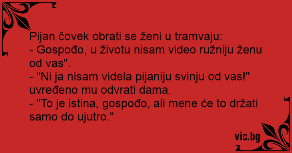 - "Ni ja nisam videla pijaniju svinju od vas!" uvređeno mu odvrati dama.