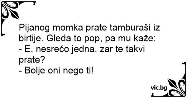Pijanog momka prate tamburaši iz birtije. Gleda to pop, pa mu kaže: