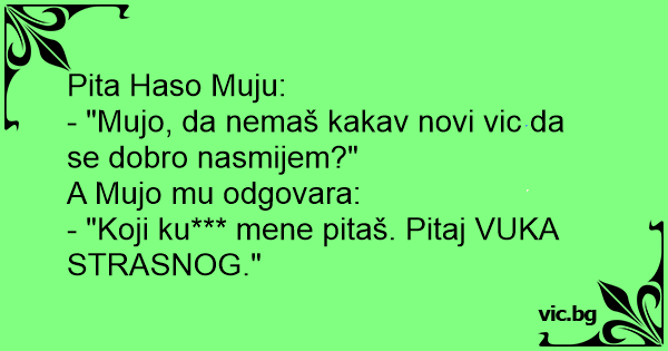 - "Mujo, da nemaš kakav novi vic da se dobro nasmijem?"