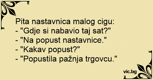 Pita nastavnica malog cigu:<br />- "Gdje si nabavio taj sat?"<br />- "Na popust nastavnice."<br />- "Kakav popust?"<br />- "Popustila pažnja trgovcu."