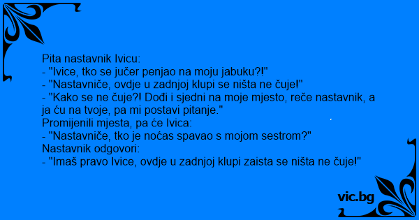 - "Kako se ne čuje?! Dođi i sjedni na moje mjesto, reče nastavnik, a ja ću na tvoje, pa mi postavi pitanje."