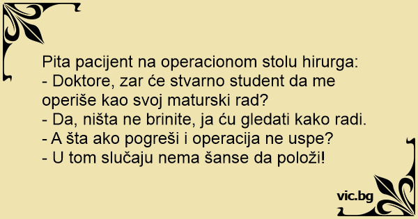 - Doktore, zar će stvarno student da me operiše kao svoj maturski rad?