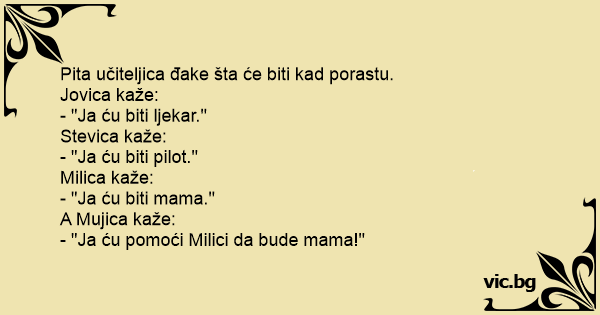 Mokytoja klausia mokinių: - Kuo jūs tapsite, kai užaugsite? - Aš būsiu kosmonautas, – sako Antanėlis. - O aš būsiu gaisrininkas, – sako Joniukas. - Aš būsiu mama, – sako Marytė. - O aš padėsiu...