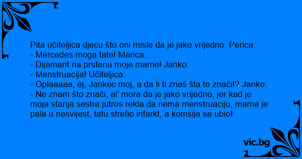 - Ne znam što znači, al' mora da je jako vrijedno, jer kad je moja starija sestra jutros rekla da nema menstruaciju, mama je pala u nesvijest, tatu strefio infarkt, a komsija se ubio!