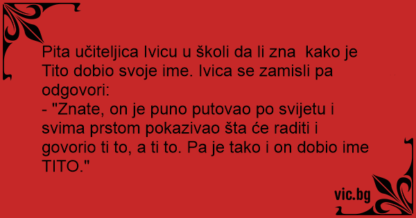 Pita učiteljica Ivicu u školi da li zna kako je Tito dobio svoje ime. Ivica se zamisli pa odgovori: