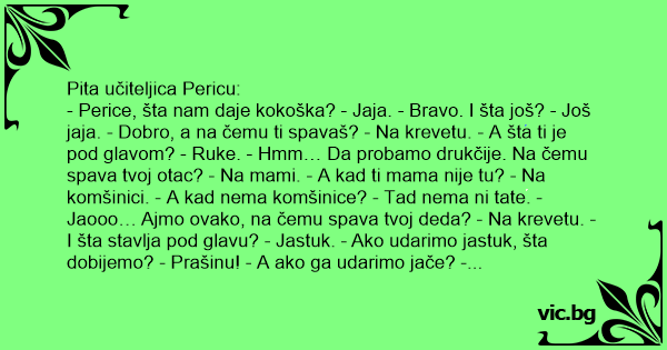 - Perice, šta nam daje kokoška? - Јаja. - Bravo. I šta još? - Јоš jaja. - Dobro, a na čemu ti spavaš? - Na krevetu. - А šta ti je pod glavom? - Ruke. - Hmm… Da probamo drukčije. Na čemu spava tvoj otac? - Na mami. - А kad ti mama nije tu? - Na komšinici. - А kad nema komšinice? - Тad nema ni tate. - Jaooo… Ajmo ovako, na čemu spava tvoj deda? - Na krevetu. - I šta stavlja pod glavu? - Јаstuk. - Ako udarimo jastuk, šta dobijemo? - Prašinu! - А ako ga udarimo jače? - Vaške! - А акo uzmeš nož i isečeš jastuk, šta dobiješ? - Šamar od dede! - Dobro, šamar, šta još? - Perje. - Еее, konačno! I znači, šta nam daje kokoška? - Pa rekao sam vam – jaja