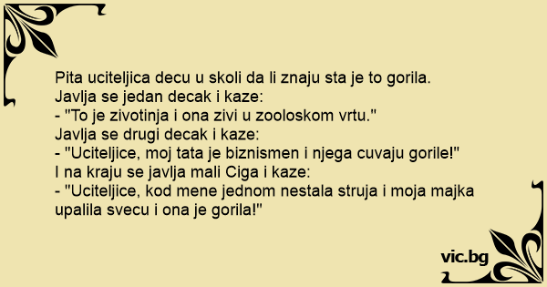 Pita uciteljica decu u skoli da li znaju sta je to gorila.