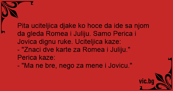 Pita uciteljica djake ko hoce da ide sa njom da gleda Romea i Juliju. Samo Perica i Jovica dignu ruke. Uciteljica kaze: