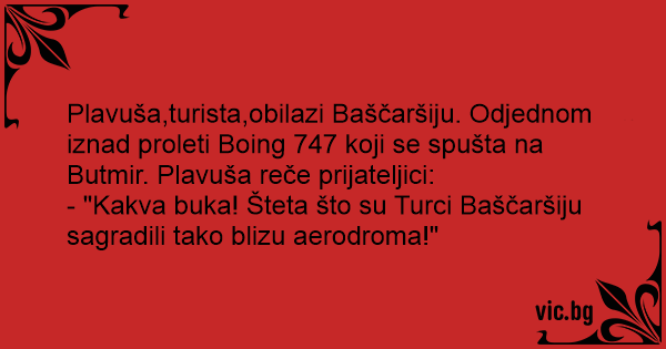Plavuša,turista,obilazi Baščaršiju. Odjednom iznad proleti Boing 747 koji se spušta na Butmir. Plavuša reče prijateljici: