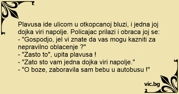 Plavusa ide ulicom u otkopcanoj bluzi, i jedna joj dojka viri napolje. Policajac prilazi i obraca joj se: