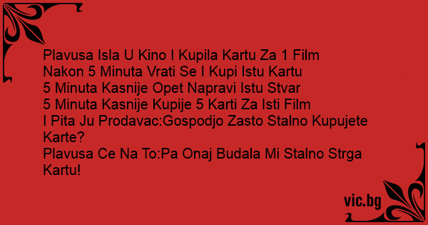 Jednog dana dođe plavuša u kino. Dođe kod blagajnika i kupi kartu, nakon 2 minute vrati se prodavaču i opet kupi kartu. Kad ono se ona opet vratila te je kupila još nekoliko karata. Nakon petog...