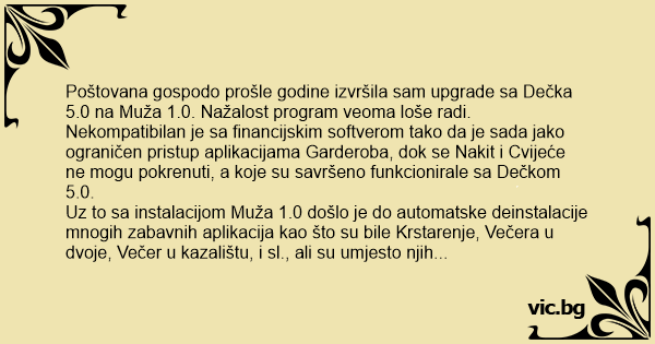 Poštovana gospodo prošle godine izvršila sam upgrade sa Dečka 5.0 na Muža 1.0. Nažalost program veoma loše radi. Nekompatibilan je sa financijskim softverom tako da je sada jako ograničen pristup aplikacijama Garderoba, dok se Nakit i Cvijeće ne mogu pokrenuti, a koje su savršeno funkcionirale sa Dečkom 5.0.