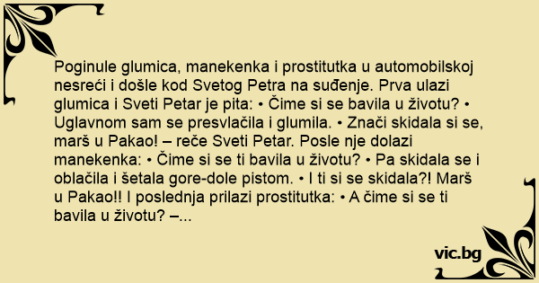 Poginule glumica, manekenka i prostitutka u automobilskoj nesreći i došle kod Svetog Petra na suđenje. Prva ulazi glumica i Sveti Petar je pita: • Čime si se bavila u životu? • Uglavnom sam se presvlačila i glumila. • Znači skidala si se, marš u Pakao! – reče Sveti Petar. Posle nje dolazi manekenka: • Čime si se ti bavila u životu? • Pa skidala se i oblačila i šetala gore-dole pistom. • I ti si se skidala?! Marš u Pakao!! I poslednja prilazi prostitutka: • A čime si se ti bavila u životu? – pita Sveti Petar. • Pa pretežno sam spavala po celi dan. A naveče se spremim i od bandere do bandere. • Hvala Bogu, električarka! – reče Sveti Petar.