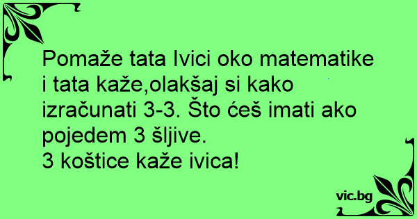 Pomaže tata Ivici oko matematike i tata kaže,olakšaj si kako izračunati 3-3. Što ćeš imati ako pojedem 3 šljive.