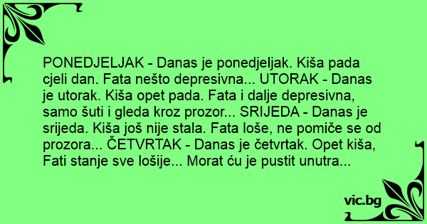 PONEDJELJAK - Danas je ponedjeljak. Kiša pada cjeli dan. Fata nešto depresivna... UTORAK - Danas je utorak. Kiša opet pada. Fata i dalje depresivna, samo šuti i gleda kroz prozor... SRIJEDA - Danas je srijeda. Kiša još nije stala. Fata loše, ne pomiče se od prozora... ČETVRTAK - Danas je četvrtak. Opet kiša, Fati stanje sve lošije... Morat ću je pustit unutra...