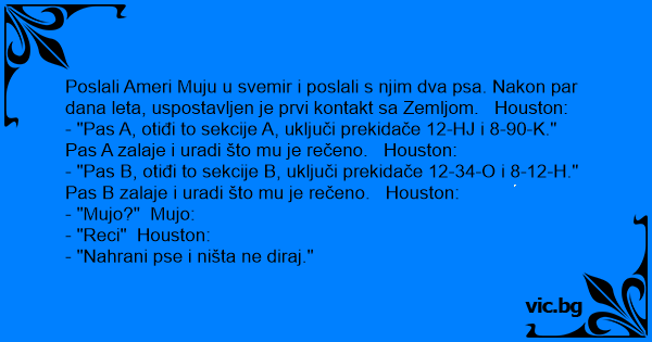 Poslali Ameri Muju u svemir i poslali s njim dva psa. Nakon par dana leta, uspostavljen je prvi kontakt sa Zemljom. Houston: