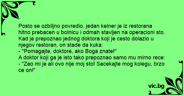 Posto se ozbiljno povredio, jedan kelner je iz restorana hitno prebacen u bolnicu i odmah stavljen na operacioni sto. Kad je prepoznao jednog doktora koji je cesto dolazio u njegov restoran, on stade da kuka: