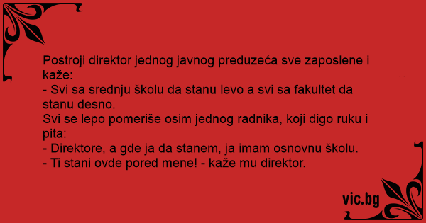Postroji direktor jednog javnog preduzeća sve zaposlene i kaže: