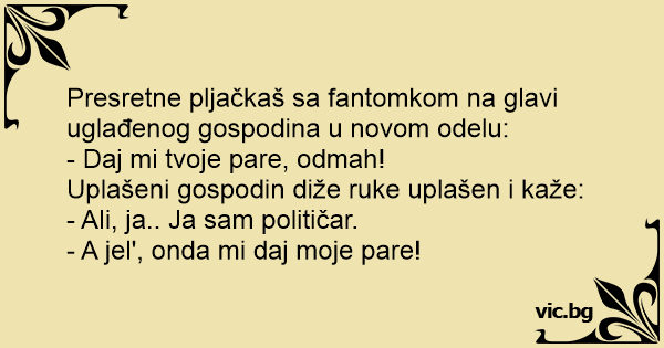 Un rapinatore va da una persona e dice: "Dammi i tuoi soldi!" Ma lui risponde: "Ma io sono un politico!" E il rapinatore risponde: "Allora dammi i miei soldi!".
