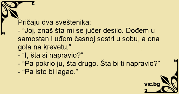 - “Joj, znaš šta mi se jučer desilo. Dođem u samostan i uđem časnoj sestri u sobu, a ona gola na krevetu.”