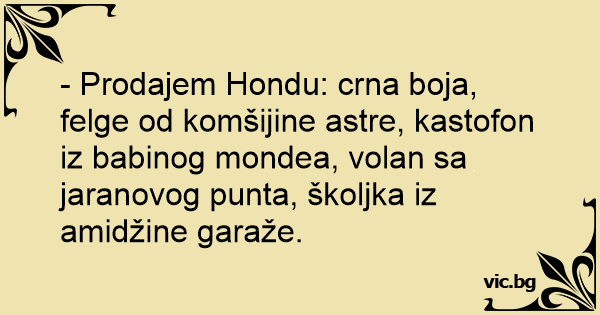 - Prodajem Hondu: crna boja, felge od komšijine astre, kastofon iz babinog mondea, volan sa jaranovog рunта, školjka iz amidžine garaže.