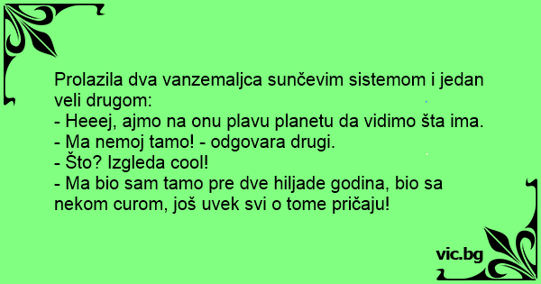 Prolazila dva vanzemaljca sunčevim sistemom i jedan veli drugom: