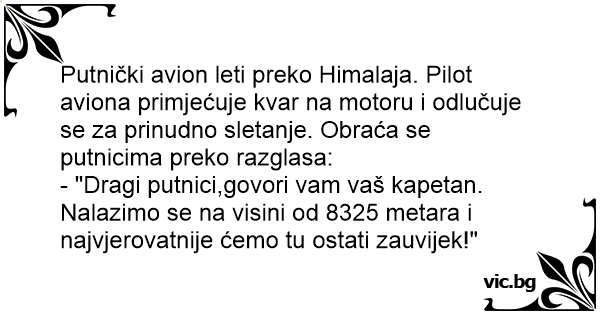 - "Dragi putnici,govori vam vaš kapetan. Nalazimo se na visini od 8325 metara i najvjerovatnije ćemo tu ostati zauvijek!"
