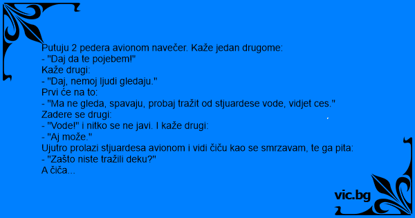 Putuju 2 pedera avionom navečer. Kaže jedan drugome: