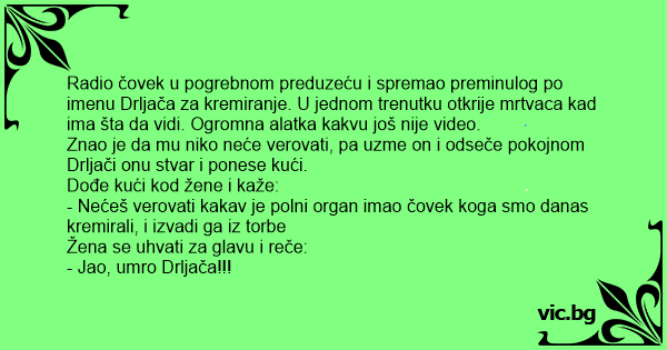 - Nećeš verovati kakav je polni оrgаn imao čovek koga smo danas kremirali, i izvadi ga iz torbe