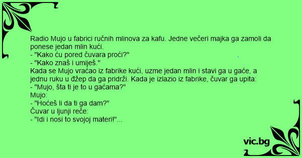 Kada se Mujo vraćao iz fabrike kući, uzme jedan mlin i stavi ga u gaće, a jednu ruku u đžep da ga pridrži. Kada je izlazio iz fabrike, čuvar ga upita:
