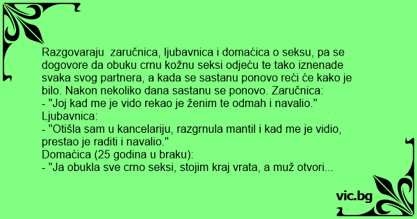 - "Ja obukla sve crno seksi, stojim kraj vrata, a muž otvori vrata, gleda i reče: