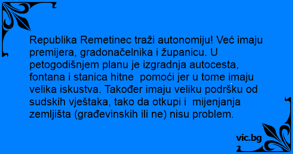 Republika Remetinec traži autonomiju! Već imaju premijera, gradonačelnika i županicu. U petogodišnjem planu je izgradnja autocesta, fontana i stanica hitne pomoći jer u tome imaju velika iskustva. Također imaju veliku podršku od sudskih vještaka, tako da otkupi i mijenjanja zemljišta (građevinskih ili ne) nisu problem.