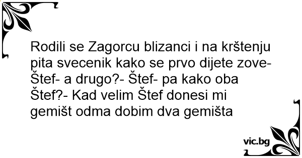 Rodili se Zagorcu blizanci i na krštenju pita svecenik kako se prvo dijete zove- Štef- a drugo?- Štef- pa kako oba Štef?- Kad velim Štef donesi mi gemišt odma dobim dva gemišta