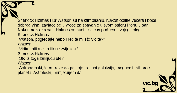 Sherlock Holmes i Dr Watson su na kampiranju. Nakon obilne vecere i boce dobrog vina, zavlace se u vrece za spavanje u svom satoru i tonu u san. Nakon nekoliko sati, Holmes se budi i isti cas protrese svojeg kolegu. Sherlock Holmes: "Watson, pogledajte nebo i recite mi sto vidite?" Watson: "Vidim milione i milione zvijezda." Sherlock Holmes: "Sto iz toga zakljucujete?" Watson: "Astronomski, to mi kaze da postoje milijuni galaksija, moguce i milijarde planeta. Astroloski, primjecujem da je Saturn u Lavu. Vremenski, zakljucujem da je otprilike 3 ujutro. Teoloski, vidim da je Bog svemocan, a mi smo mali i neznacajni. Meteoroloski, mislim da cemo sutra imati krasan dan. A Vi, Holmes, sto Vi zakljucujete?" Sherlock Holmes nakon kratke pauze izjavljuje: "Watson, Vi ste telac - maznuli su nam sator!"