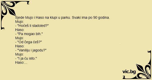 Sjede Mujo i Haso na klupi u parku. Svaki ima po 90 godina.