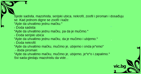 Sjede sadista, mazohista, serijski ubica, nekrofil, zoofil i piroman i dosađuju se. Kad jednom digne se zoofil i kaže: