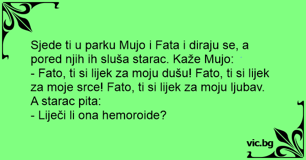 Sjede ti u parku Mujo i Fata i diraju se, a pored njih ih sluša starac. Kaže Mujo:
