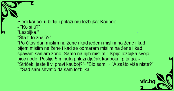 "Po čitav dan mislim na žene i kad jedem mislim na žene i kad pijem mislim na žene i kad se odmaram mislim na žene i kad spavam sanjam žene. Samo na njih mislim." Ispije lezbijka svoje piće i ode. Poslije 5 minuta prilazi dječak kauboju i pita ga. - "Striček, jeste li vi pravi kauboj?"- "Bio sam.' - "A zašto više niste?"