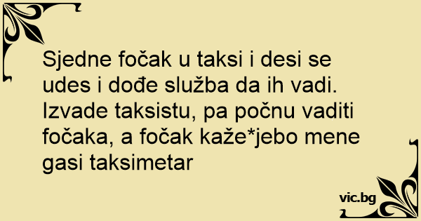 Sjedne fočak u taksi i desi se udes i dođe služba da ih vadi. Izvade taksistu, pa počnu vaditi fočaka, a fočak kaže*jebo mene gasi taksimetar
