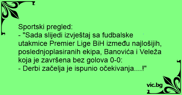- "Sada slijedi izvještaj sa fudbalske utakmice Premier Lige BiH između najlošijih, poslednjoplasiranih ekipa, Banovića i Veleža koja je završena bez golova 0-0: