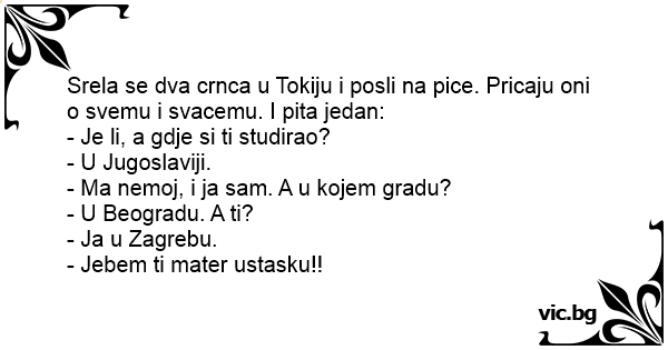 Srela se dva crnca u Tokiju i posli na pice. Pricaju oni o svemu i svacemu. I pita jedan: