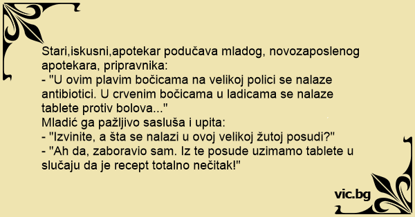- "Ah da, zaboravio sam. Iz te posude uzimamo tablete u slučaju da je recept totalno nečitak!"
