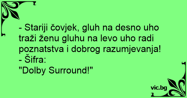 - Stariji čovjek, gluh na desno uho traži ženu gluhu na levo uho radi poznatstva i dobrog razumjevanja!