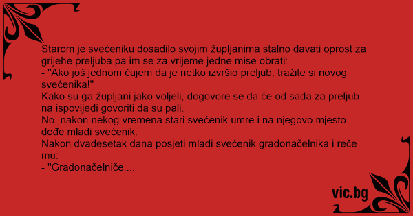 Starom je svećeniku dosadilo svojim župljanima stalno davati oprost za grijehe preljuba pa im se za vrijeme jedne mise obrati: