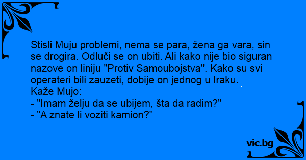 Stisli Muju problemi, nema se para, žena ga vara, sin se drogira. Odluči se on ubiti. Ali kako nije bio siguran nazove on liniju "Protiv Samoubojstva". Kako su svi operateri bili zauzeti, dobije on jednog u Iraku.