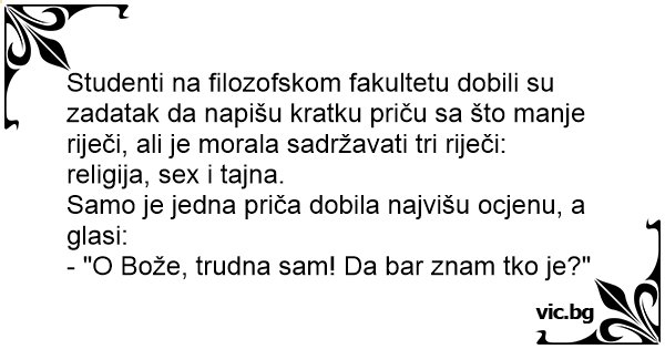 Studenti na filozofskom fakultetu dobili su zadatak da napišu kratku priču sa što manje riječi, ali je morala sadržavati tri riječi: religija, sеx i tajna.