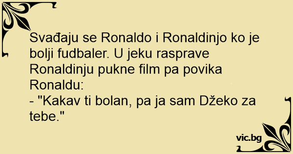Svađaju se Ronaldo i Ronaldinjo ko je bolji fudbaler. U jeku rasprave Ronaldinju pukne film pa povika Ronaldu: